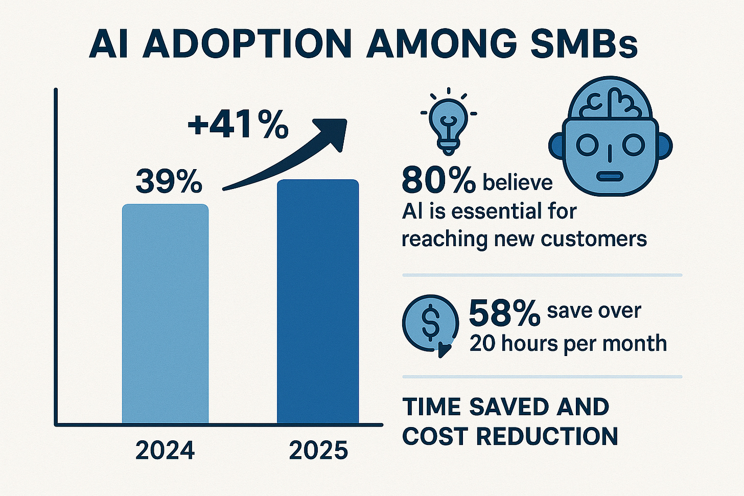AI adoption among small businesses surged by 41% in 2025, with current usage jumping from 39% in 2024 to 55% in 2025 (Business Wire).